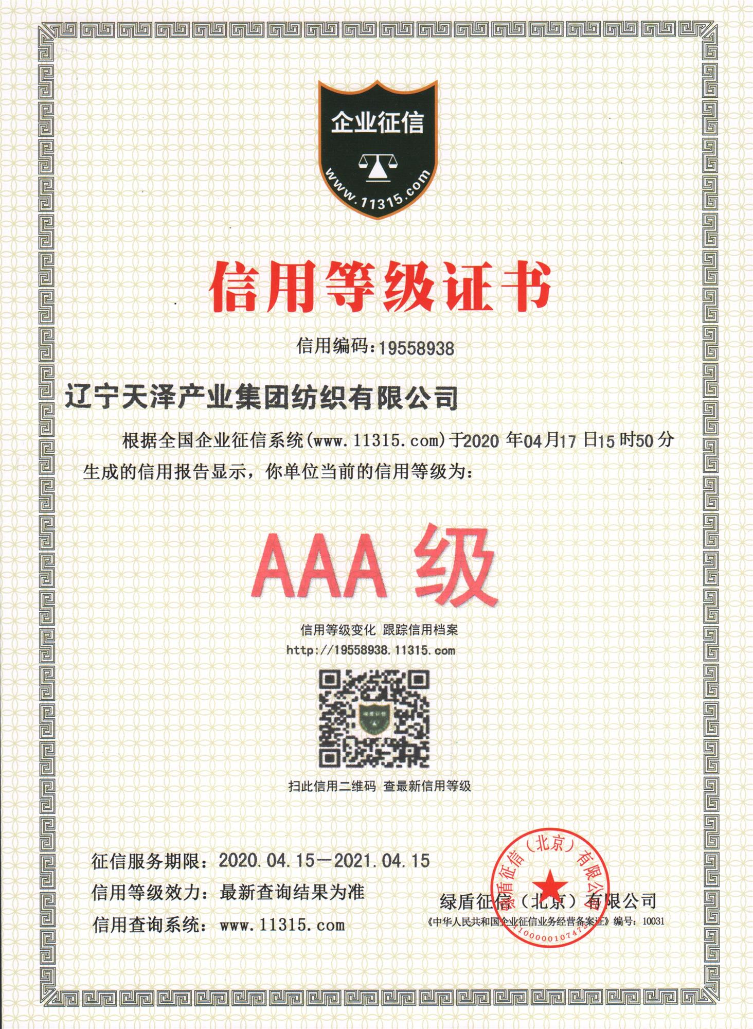 遼寧天澤產(chǎn)業(yè)集團(tuán)紡織有限公司信用等級為AAA級。