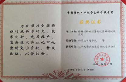 中國紡織工業(yè)聯(lián)合會特種材料雙層異構(gòu)科學(xué)進(jìn)步二等獎