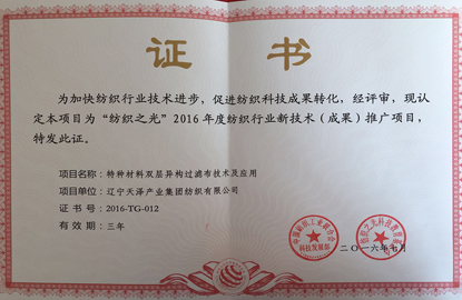 中國(guó)紡織工業(yè)聯(lián)合會(huì)特種材料雙層異構(gòu)科學(xué)進(jìn)步二等獎(jiǎng)